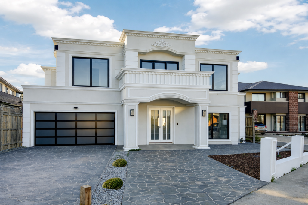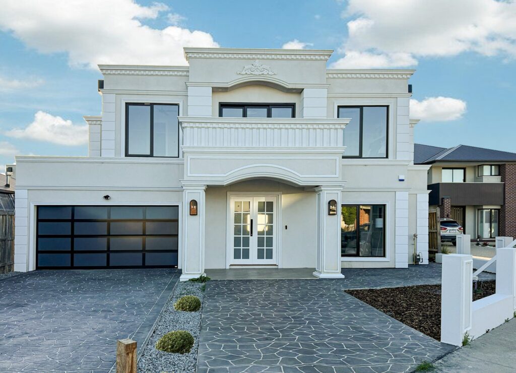 Crisp white render, decorative cornices, and symmetrical lines give the home a luxurious yet understated character. The wide driveway, modern garage door, and carefully planned landscaping complete the exterior, blending traditional charm with contemporary comfort.