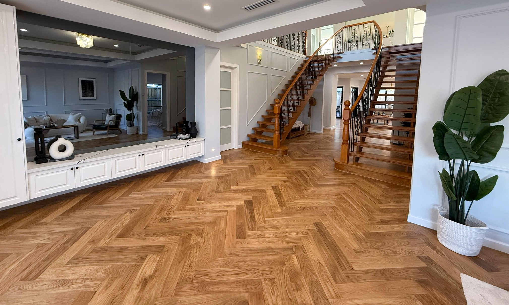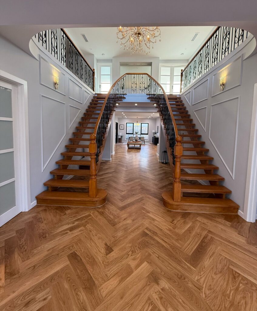 This home is designed around a timeless modern-classic theme that flows seamlessly throughout every space. Soft neutral tones, elegant wall paneling, and warm herringbone wooden flooring create a refined yet inviting atmosphere. The interiors feel bright and open, enhanced by natural light and a carefully balanced color palette that adds calmness and sophistication.